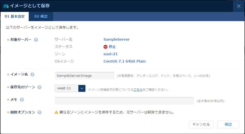 まずは、先ほど作成したサーバーを停止します(完全に停止するまで少々時間がかかります)。 サーバーが完全に停止したら、選択したサーバーの操作から、「イメージとして保存」を選択します。 すると、以下の画面になりますのでイメージ名と保存先リージョンを決定し、イメージを作成してください(イメージの作成には少々時間がかかります)。
