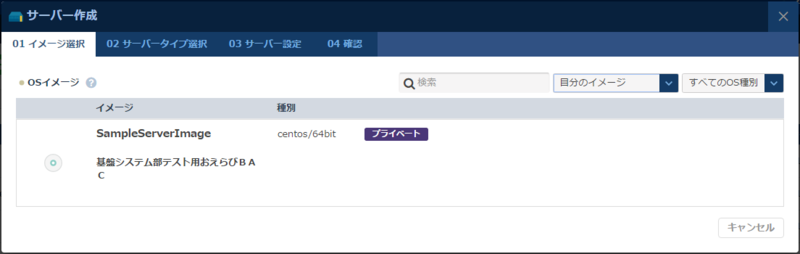 イメージの作成が完了したら、そのイメージから別リージョンにサーバーを作成します。 まずはeast-1でイメージからサーバーを作成したいと思います。通常のサーバー作成と同様に、「サーバー作成」を選択してください。 次に、OSイメージ選択画面で、イメージ種別の「自分のイメージ」を選択してください。