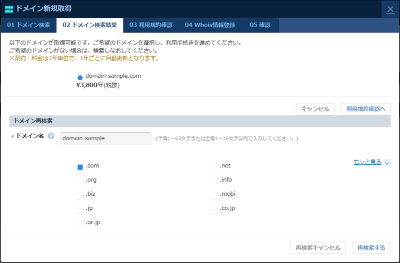 ドメインの取得もニフティクラウドのコントロールパネルから簡単にできます。 取得したいドメインを入力し検索すると、取得可能なドメインが表示されます。利用規約を確認し、Whois情報登録をすれば簡単に取得できます。