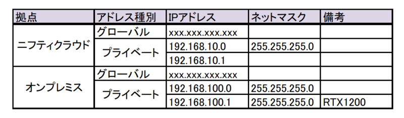 ニフティクラウド上にプライベートLANを作成する際に決定します。オンプレミス側のLANとネットワークアドレスが重複しないように設定します。 今回は、ネットワークアドレス192.168.10.0/24を使用します。