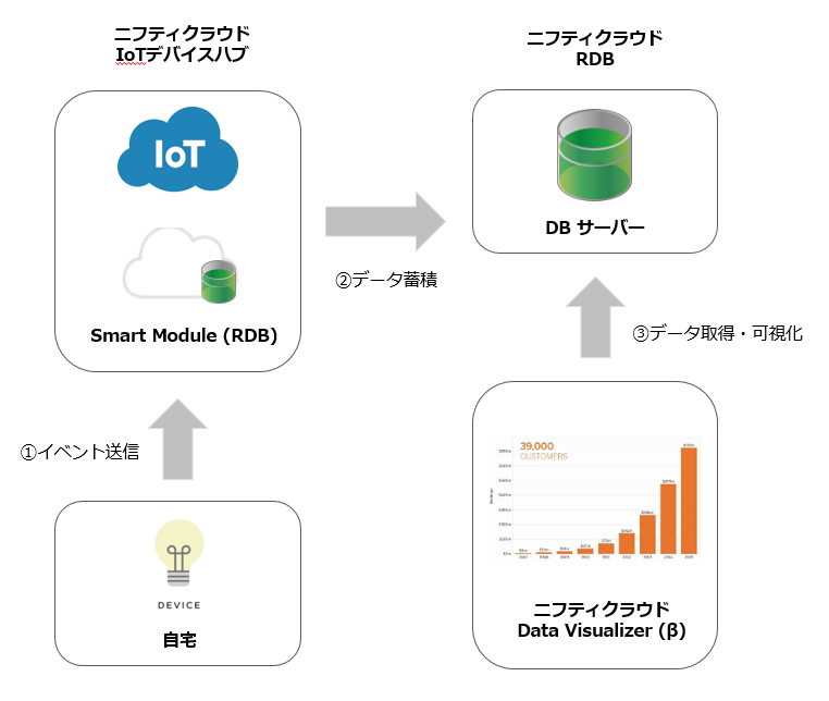 - 自宅に置いたデバイスがIoTデバイスハブのSmart Module for RDBへとイベントを送信します。