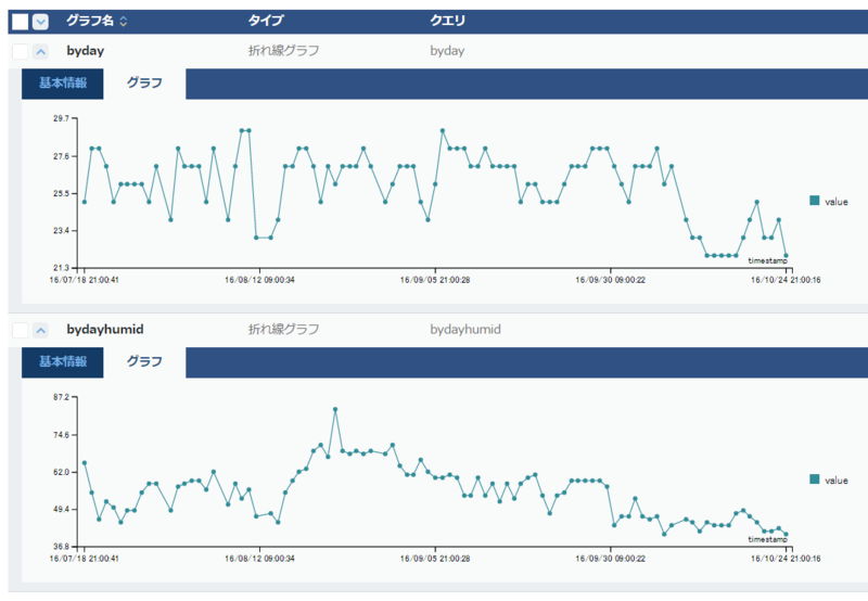 結果からお見せするとこんな感じになりました。6月~11月くらいまでの僕の部屋の温度の移り変わりを可視化することができました。上が温度で下が湿度になります。 (これだけだと地味すぎてなんのことやらという感じですが、温度だけでなくお客様がお持ちの任意のデータを可視化することができます!)