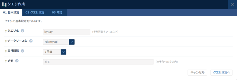 さらに、上記のrdbmysql データソースから、どんな切り口で可視化を行いたいのかを指定するクエリを作成します。