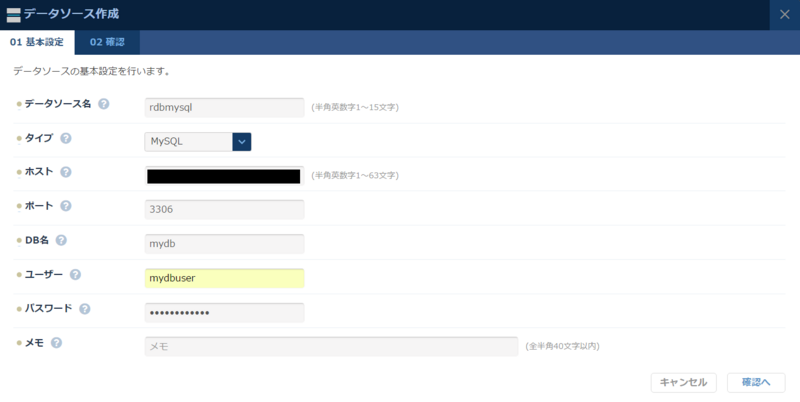 次に、上記でデータが蓄積されたRDBの接続情報を入力し、rdbmysqlという名前でデータソースを作成します。